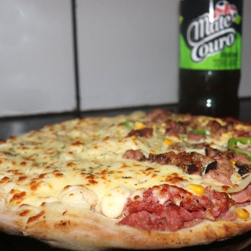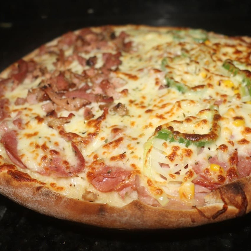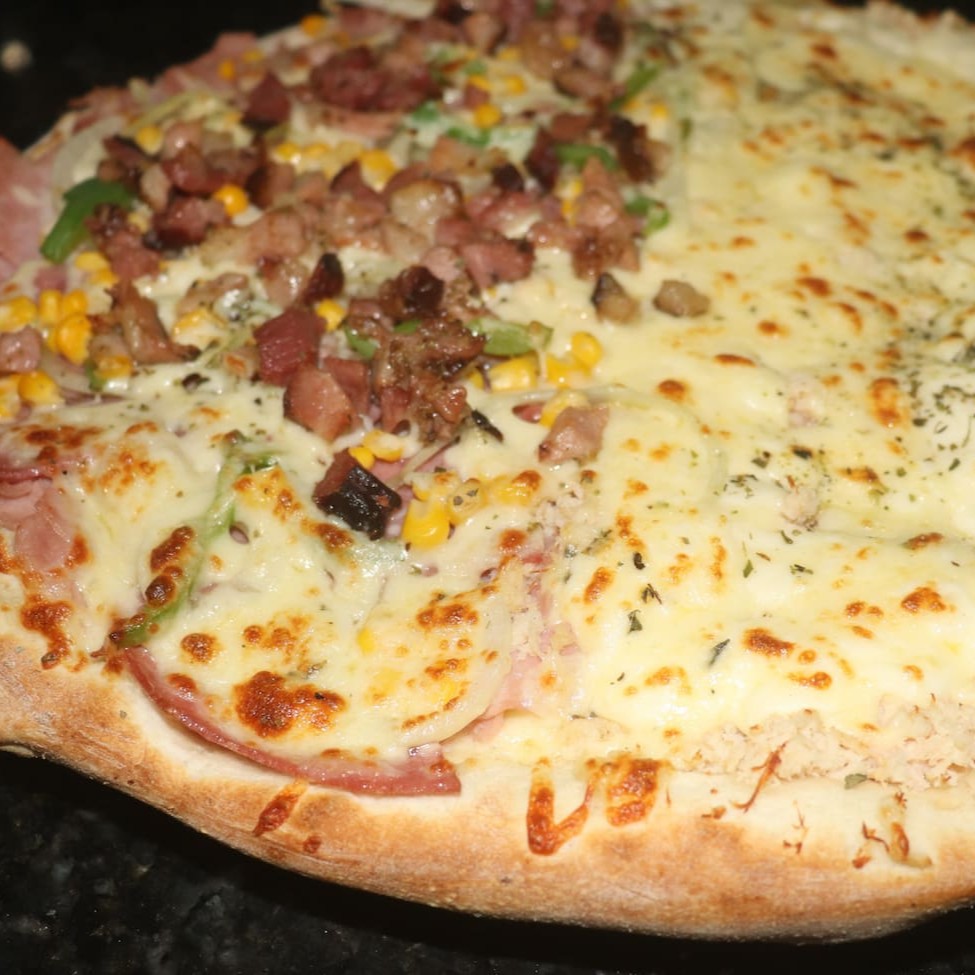 Dois sabores que deixa uma sensação de sabor inesperadamente incrível. Com muita calabresa, bacon e mussarela de um lado e a queridinha do outro lado. Calabresa vai: mussarela, calabresa, cebola e orégano. Á Moda : mussarela, presunto, calabresa, bacon, cebola, pimentão, milho e orégano