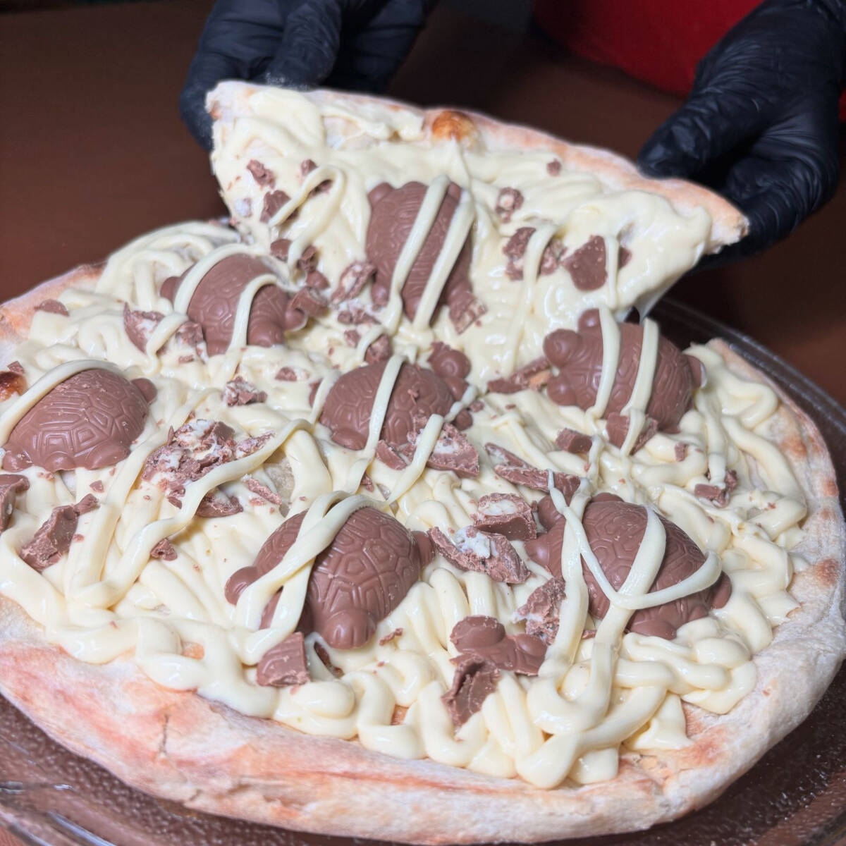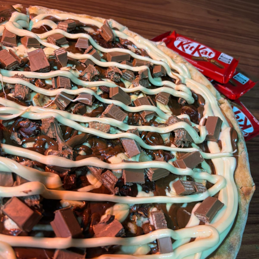 Uma pizza com sabor inigualável, com chocolate KitKat deixando tudo perfeito. Nutella, Ouro Branco e Ninho!