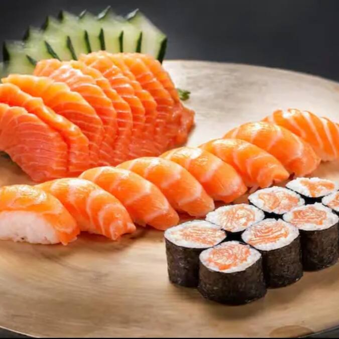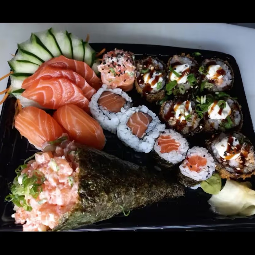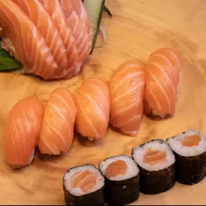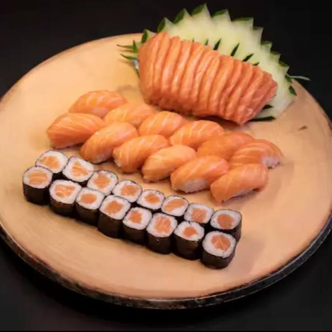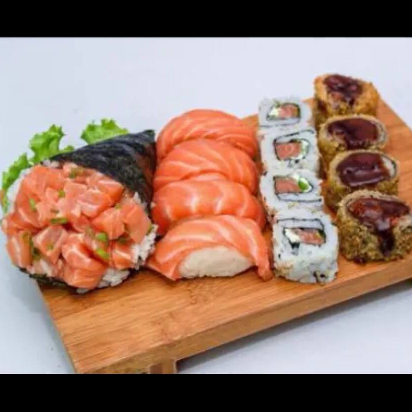 1 temaki Filadélfia, 02 maki salmão, 02 uramaki Filadélfia, 3 sashimi salmão, 02 niguiri salmão e 6 hot grelhado especial