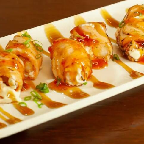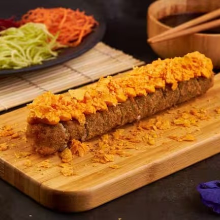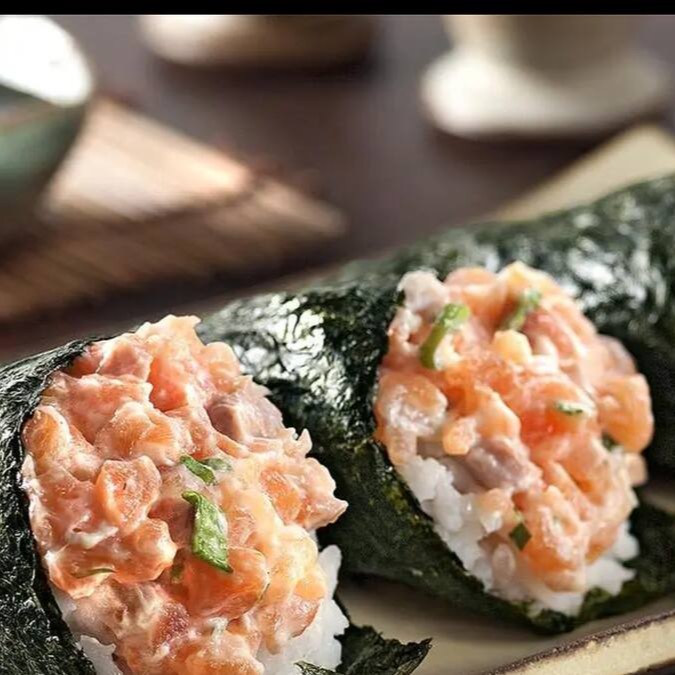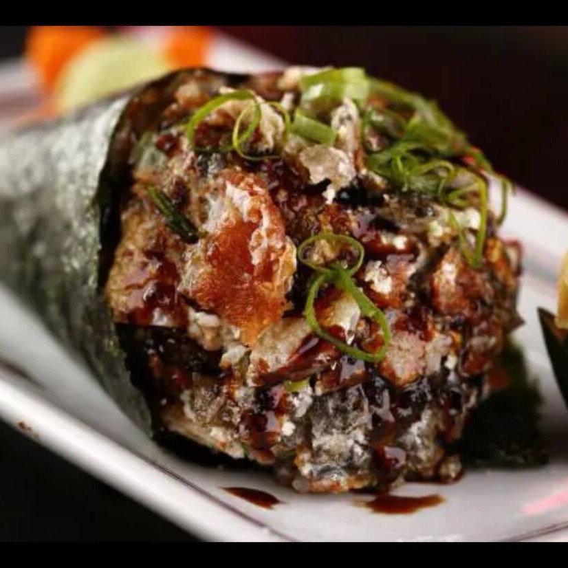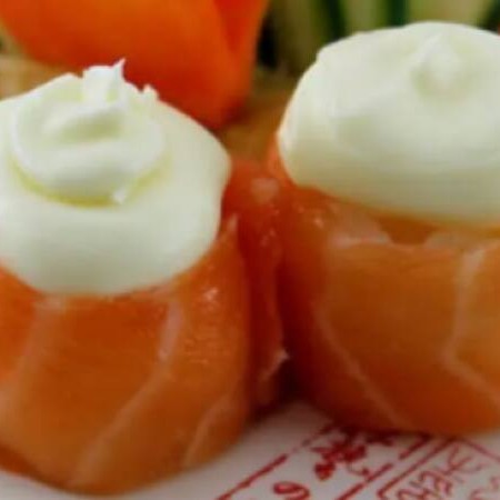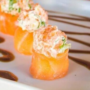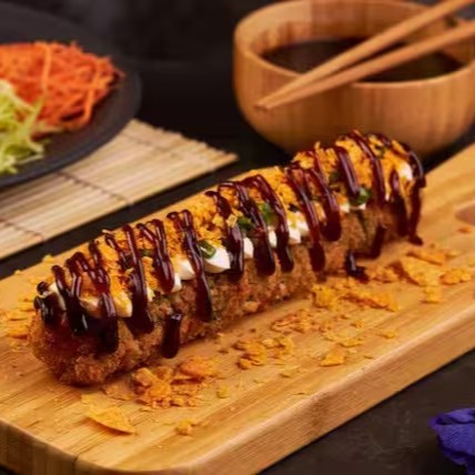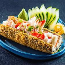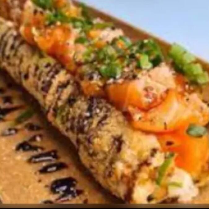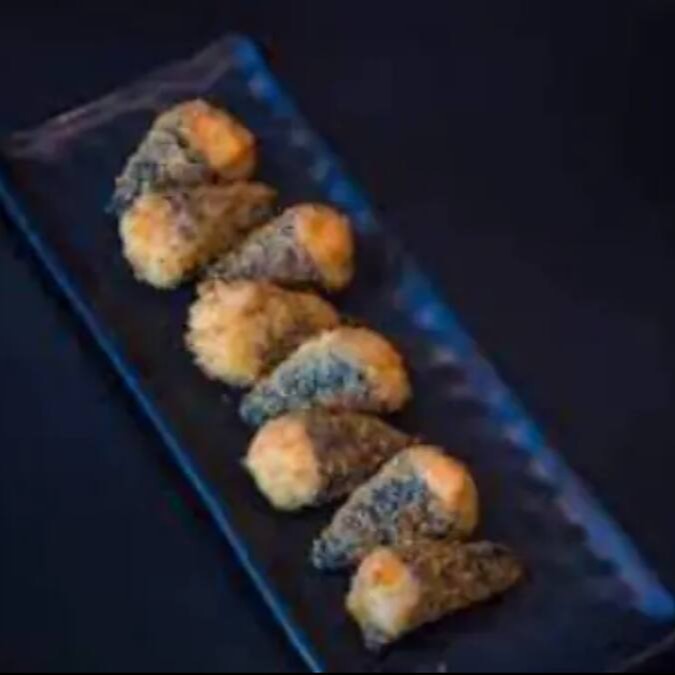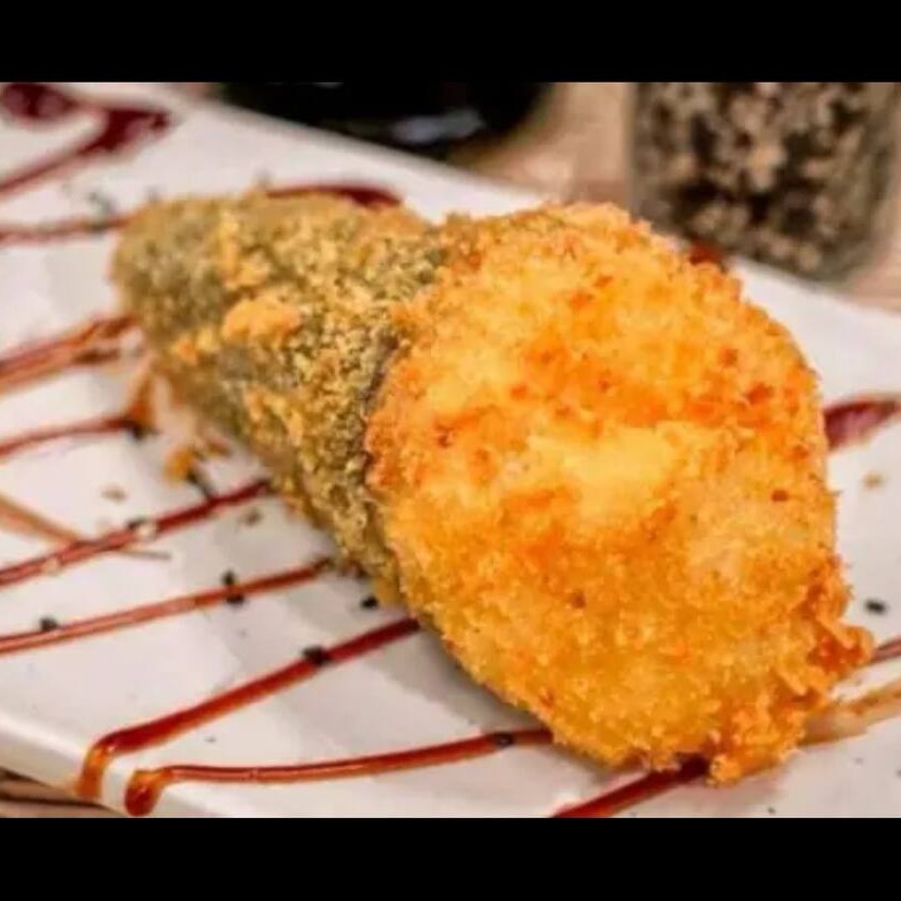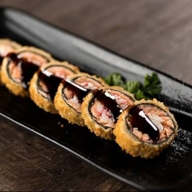 Um maki sem shari, recheado com lâminas de salmão, chease e Kani , empanado na farinha panko trazendo toda a crocancia desta peça que é um sucesso Toshijapa