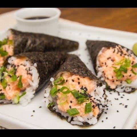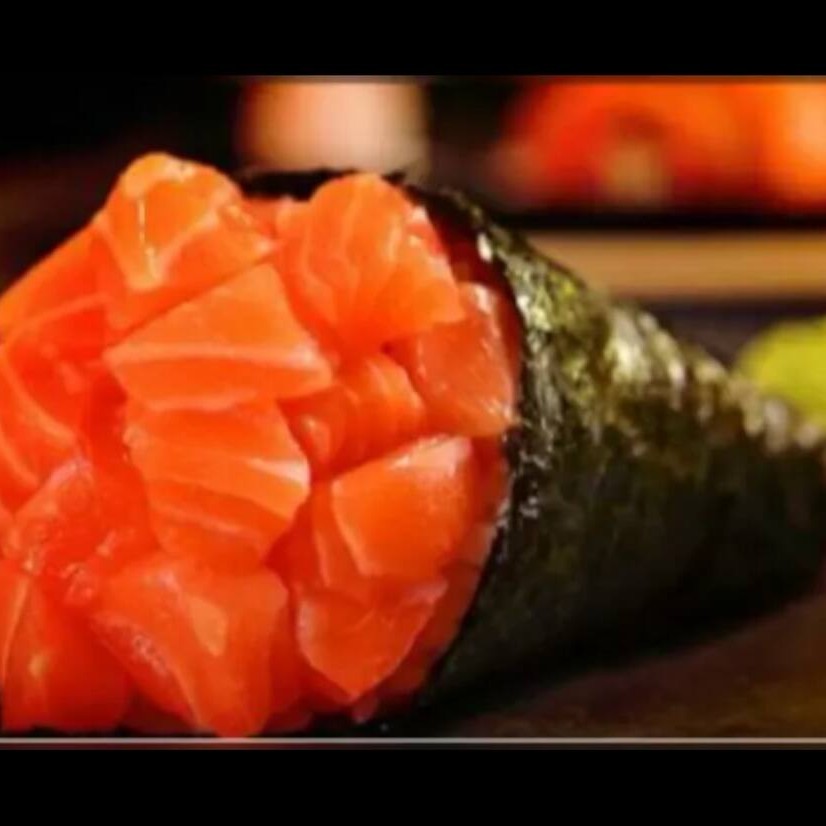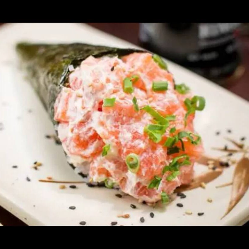 É um grande sucesso de nossa cozinha, são 6 cones com salmão, chease e cebolinha empanado na farinha panko e frito, que maravilha