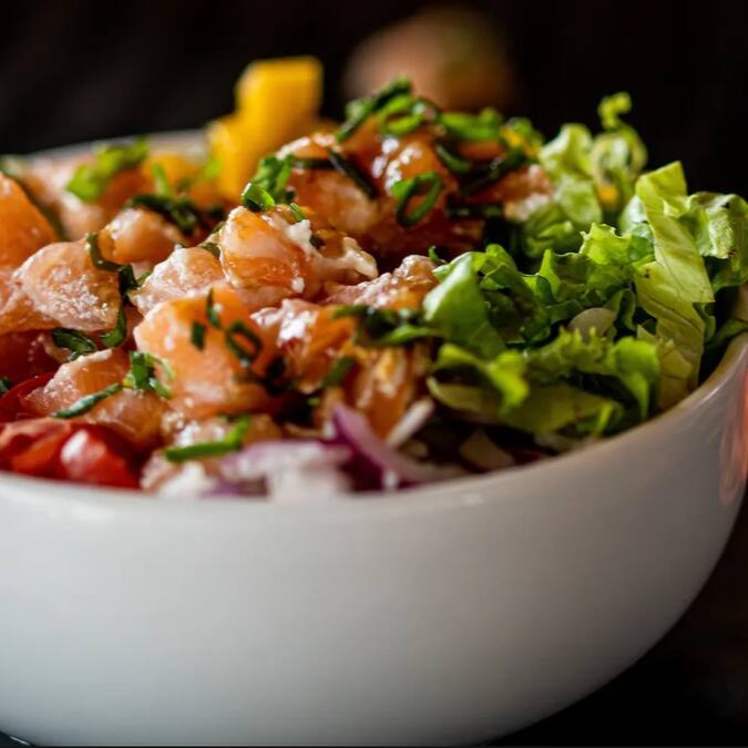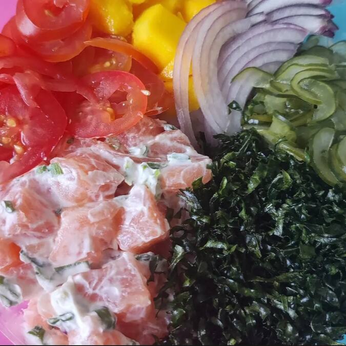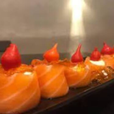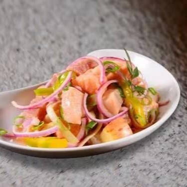 Salmão em cubos temperados e marinado no suco de limão com hondashi, cebola roxa, e geleia de pimenta, azeite trufado na sua finalização