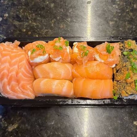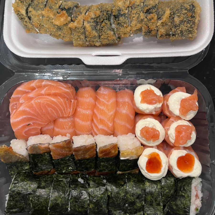 6 sushi salmão, 3 sushi skin, 3 sushi kani, 10 maki grelhado especial com chease, 4 jo salmão, 2 sashimis, 12 hot filadephia especial