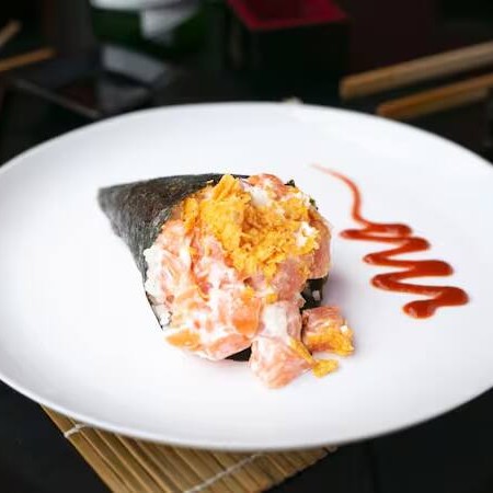 Um delicioso temaki mexicano especial, salmão fresco, Doritos, pimenta siracha finalizado no tare
