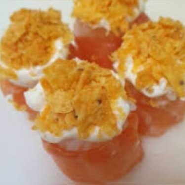 Shari, salmão envolto, sobreposto de chease e Doritos
