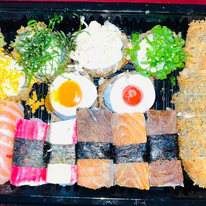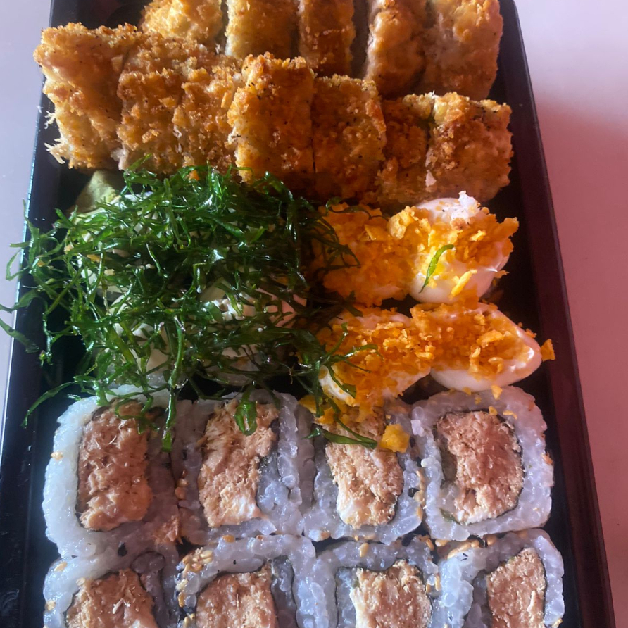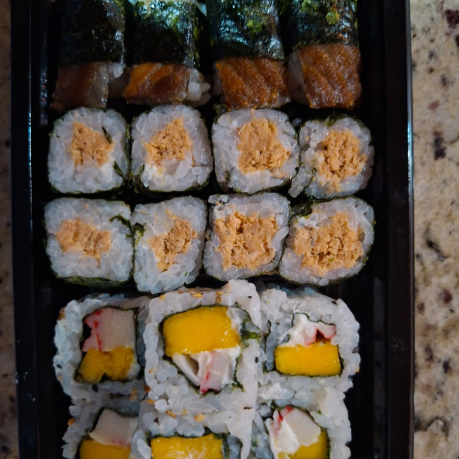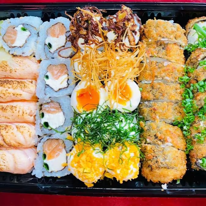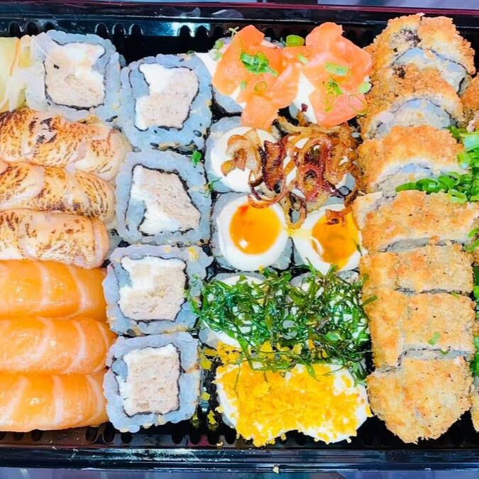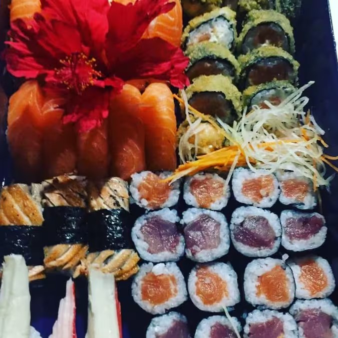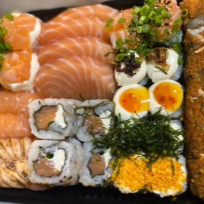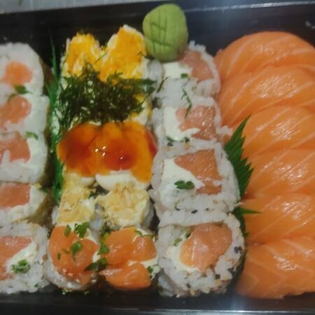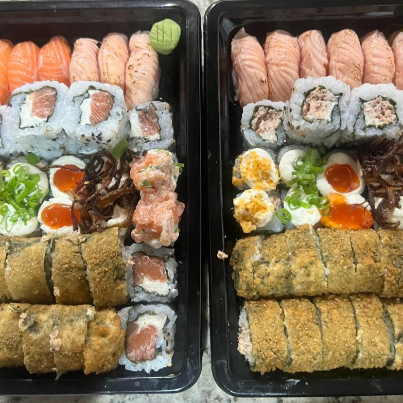4 Sushis De Salmão 4 Sushi Kani 2 Sushi Skin 8 Urmaki California 8 Uramaki grelhado 2 Maki Couve 2 Maki Doritos 2 Maki Geleia De Pimenta 2maki Cebola Desidratada 2 Maki 10 Uramaki Salmão Grelhado 10 Hot Philadelfia