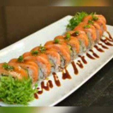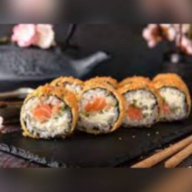 Uramaki especial Uramaki de salmãocom camarão empanado coberto com fatias de salmão creme cheese e molho especial