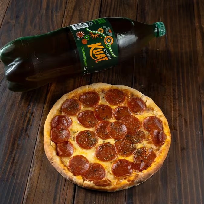 1 Pizza 8 Fatias 2 sabores Meio a meio acompanha 1 Kuat 2l