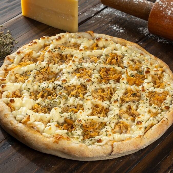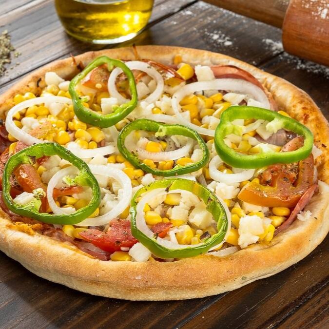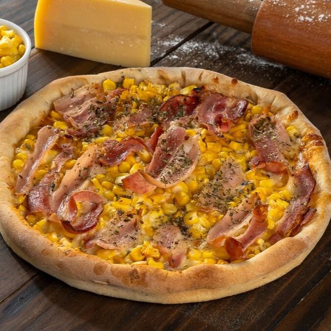 Massa artesanal, Molho de tomates, Mussarela, Presunto, calabresa, Bacon, Frango desfiado, tomate, pimentão, Palmito, Cebola, Milho e Orégano