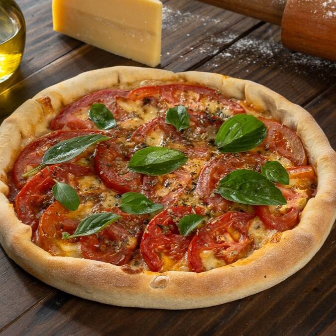 Massa Artesanal, Molho especial, muçarela, Tomate, manjericão e orégano