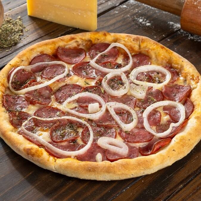 Massa Artesanal, Molho especial, muçarela, Calabresa, Cebola e oregano
