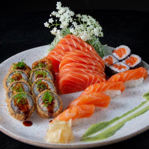 10 sashimi de salmão, 6 sushi de salmão, 8 salmão maki + 6 Bolinhos de peixe empanados ao panko e servidos com molho agridoce picante. Não permitido alterações em combos promocionais.