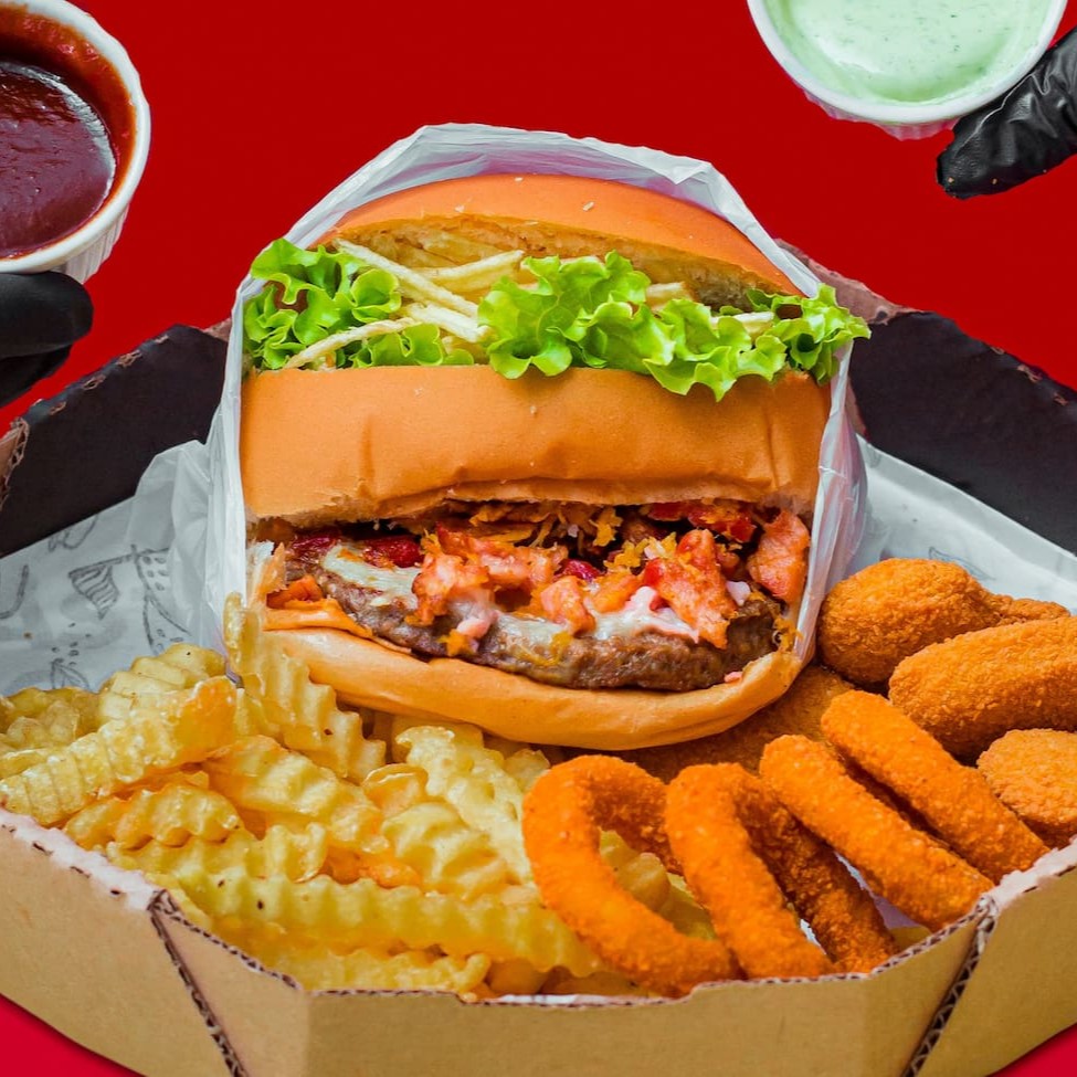 Delicie-se com o nosso irresistível 'Fome Infinita', um combo cuidadosamente composto por um suculento hambúrguer 'Gamora', que traz em sua composição pão macio, uma generosa fatia de carne de boi, queijo mussarela derretido, bacon crocante, frango desfiado saboroso, calabresa picante e uma refrescante salada. Acompanha ainda quatro anéis de cebola empanados e crocantes, quatro nuggets dourados e irresistíveis, além de 150g de batata frita crocante e dourada. Para completar, uma Coca-Cola 350ml bem gelada. Uma explosão de sabor que serve perfeitamente uma pessoa.