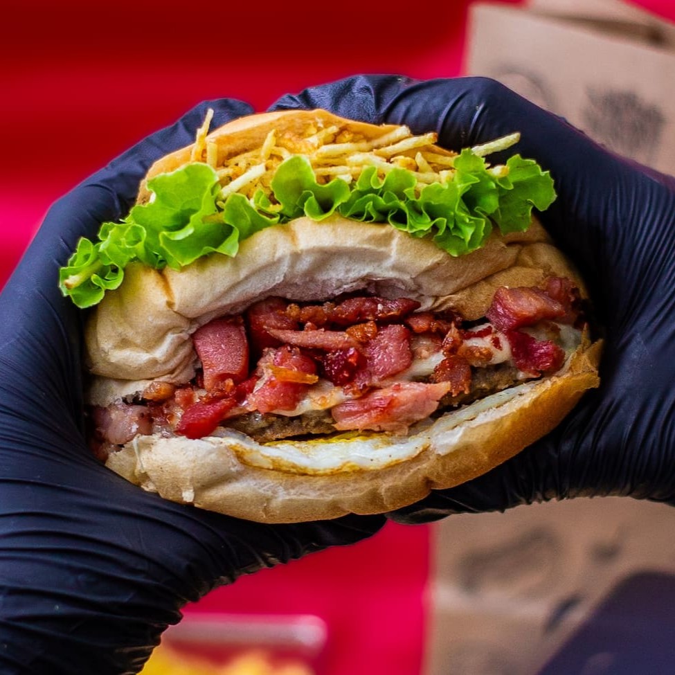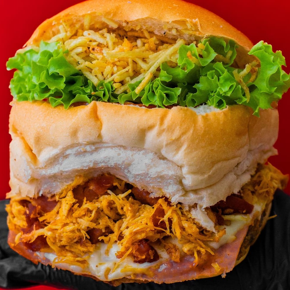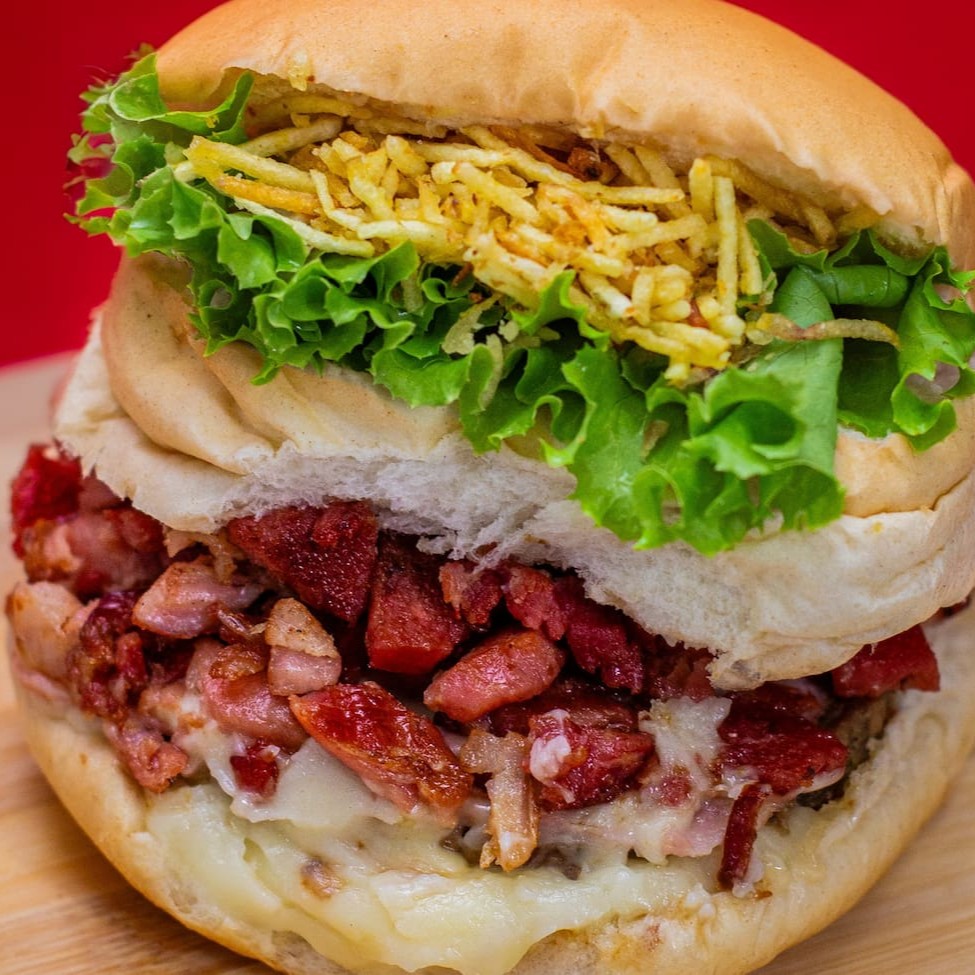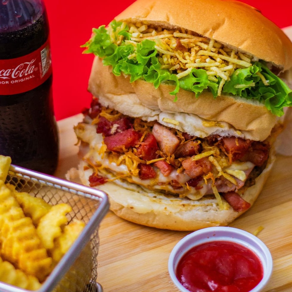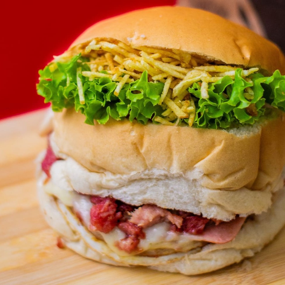 Pão De Hamburguer Fofinho Com Carne De Hamburguer Tradicional De 90g Acompanhado Por Um Bacon Premium, Com Uma Calabresa Curada, Um Delicioso Presunto E Mussarela De Alto Padrão, Um Delicioso Cheddar, Ovo Especial Alface E Tomates Slecionados E Batata Palha Crocante +Nosso Molho Da Casa Enviado Separadamente.