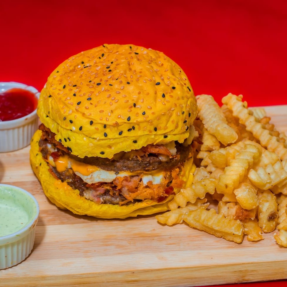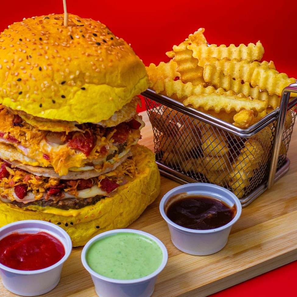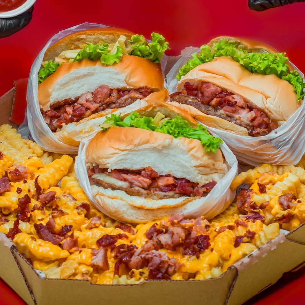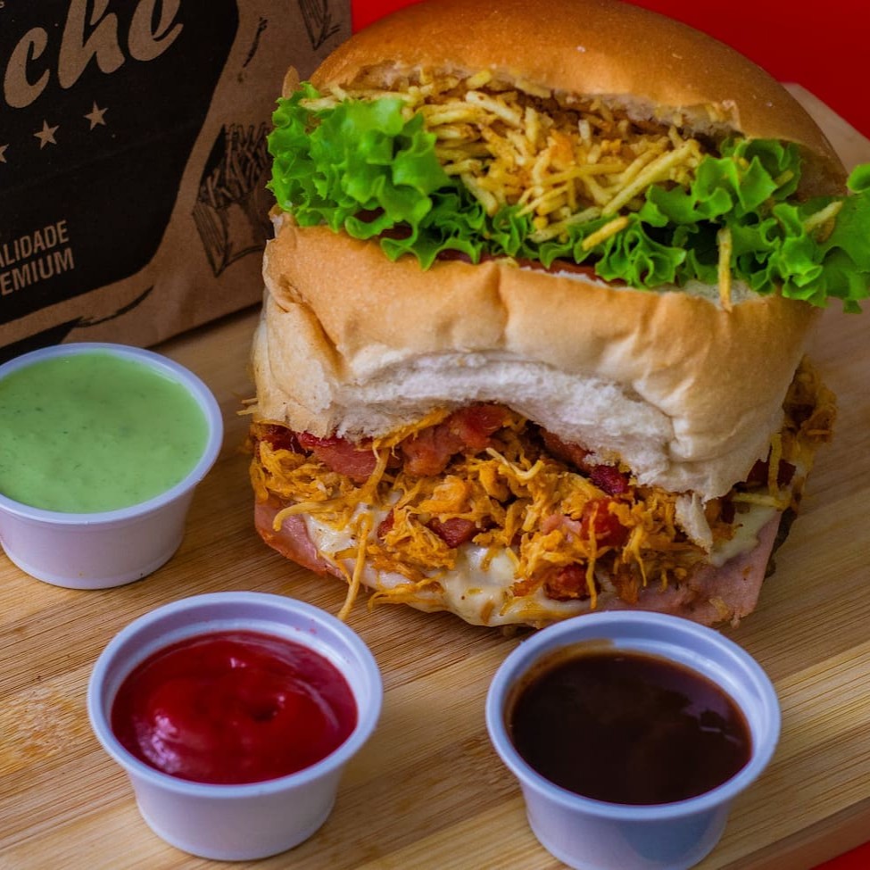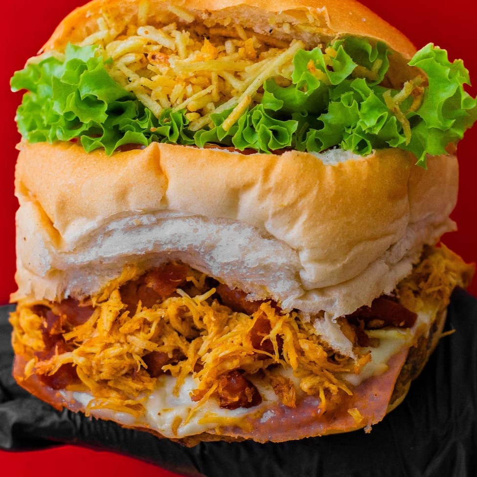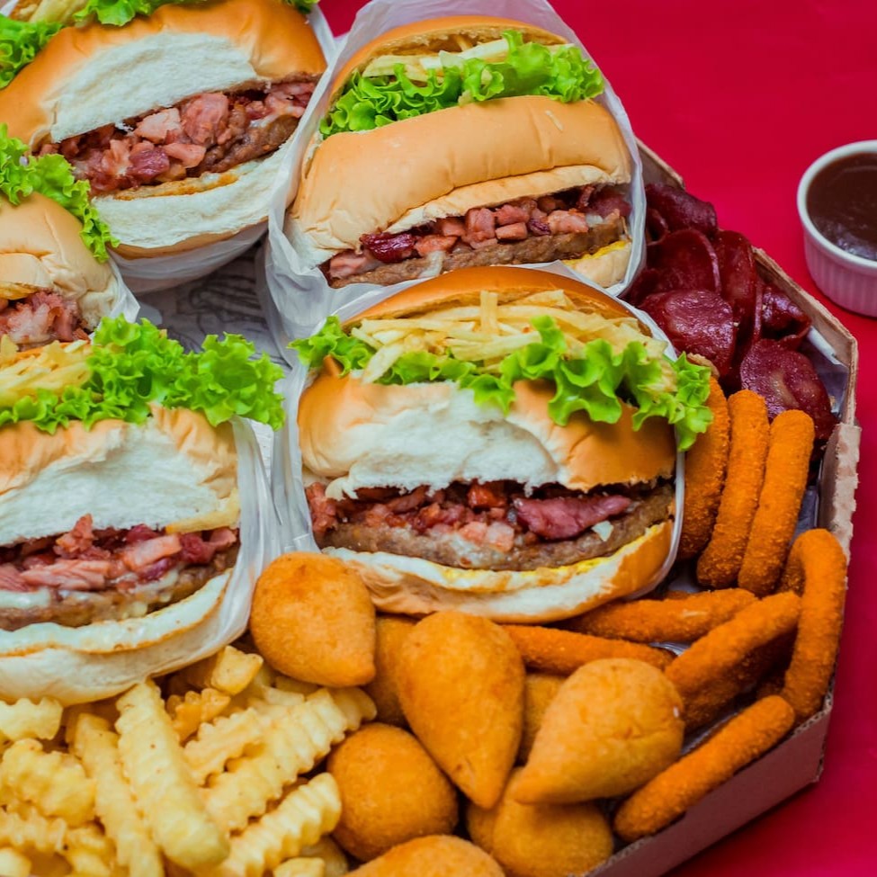 Pão De Hamburguer Fofinho Com Carne De Hamburguer Tradicional De 90g Acompanhado Por Um Bacon Premium, Com Uma Calabresa Curada, Um Delicioso Presunto E Mussarela De Alto Padrão, Um Delicioso Cheddar, Ovo Especial Alface E Tomates Slecionados E Batata Palha Crocante +Nosso Molho Da Casa Enviado Separadamente.