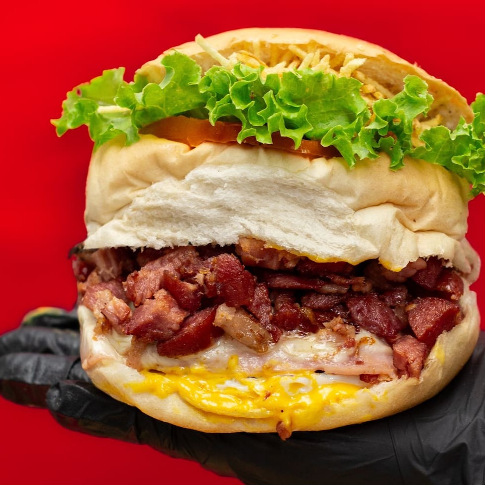 Pão, 2 carnes, dobro de queijo, ovo, dobro de bacon, frango desfiado, calabresa, cheddar, presunto, abacaxi ou banana