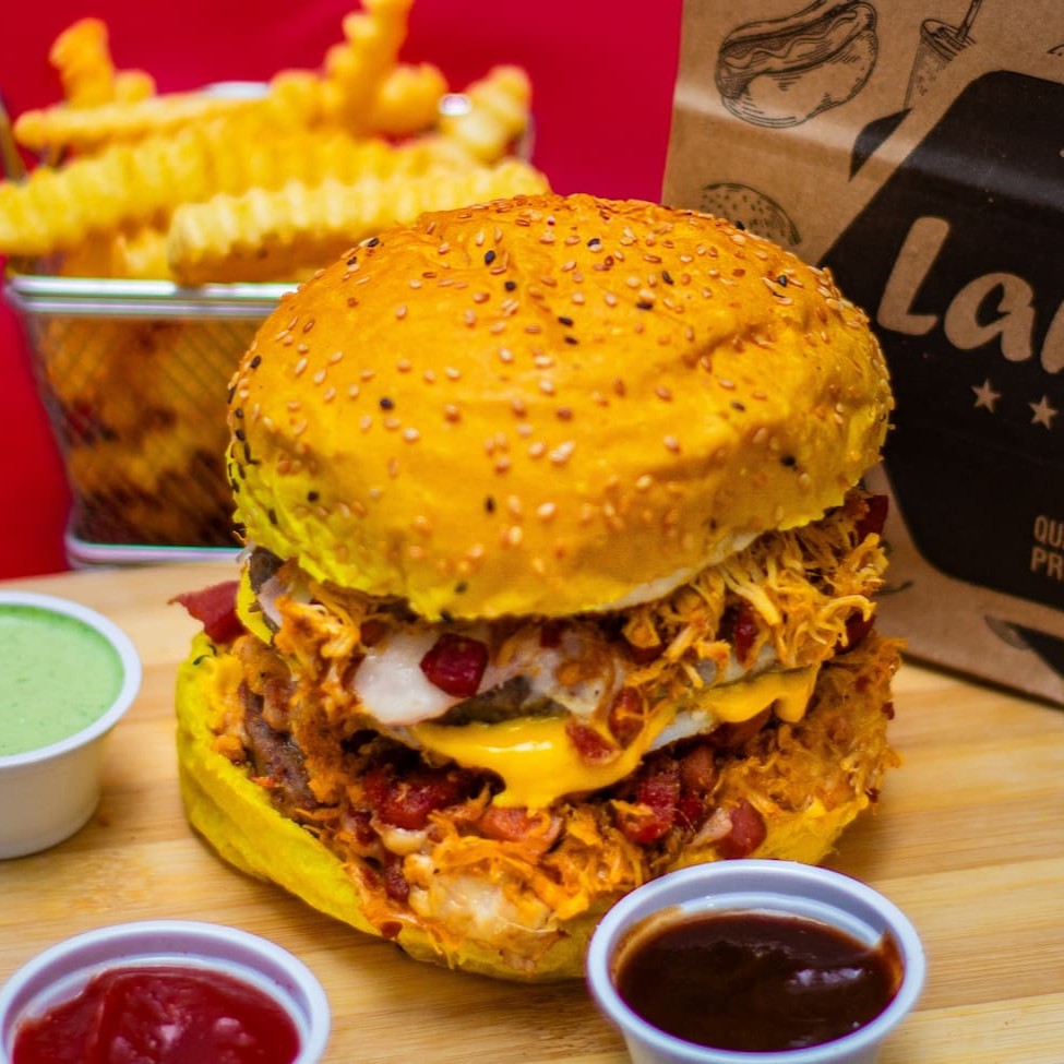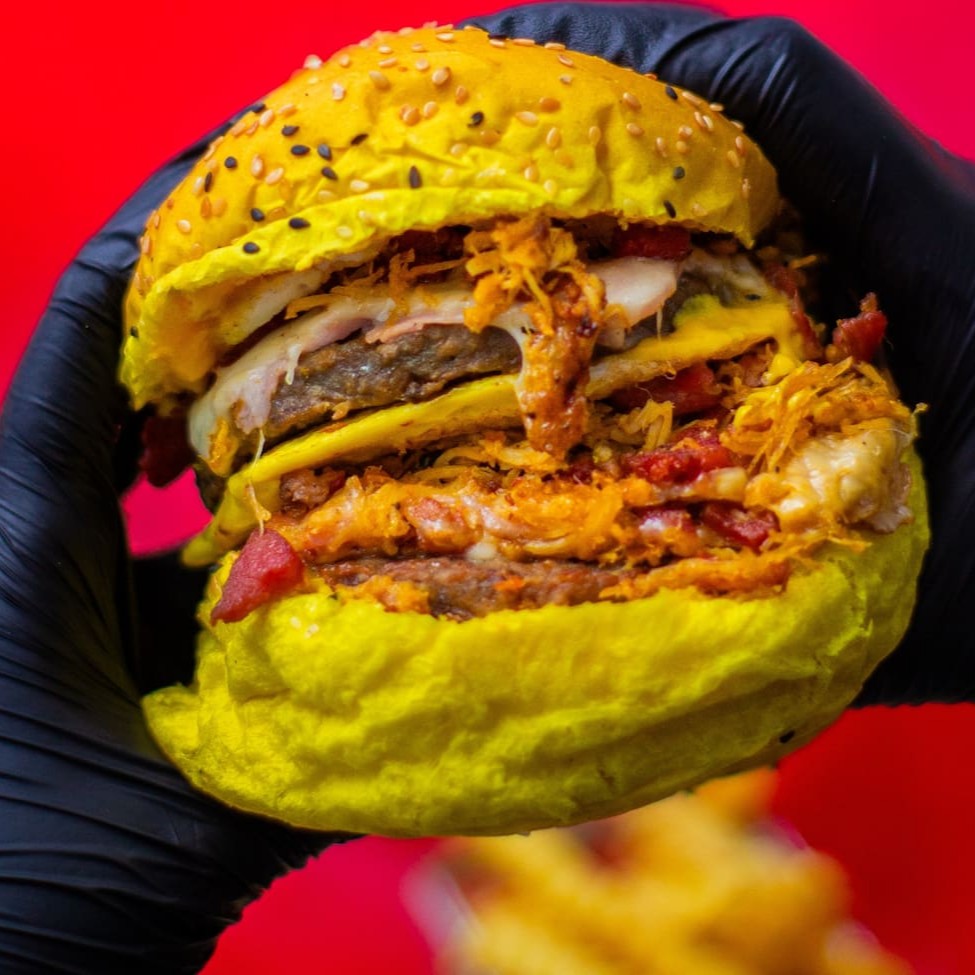 ( Não Acompanha Batata) Pão, duas carnes bovina 120g , Duas carnes de frango, queijo em dobro, bacon em dobro, frango desfiado em dobro, cheddar ou Catupiry, abacaxi ou banana, salada