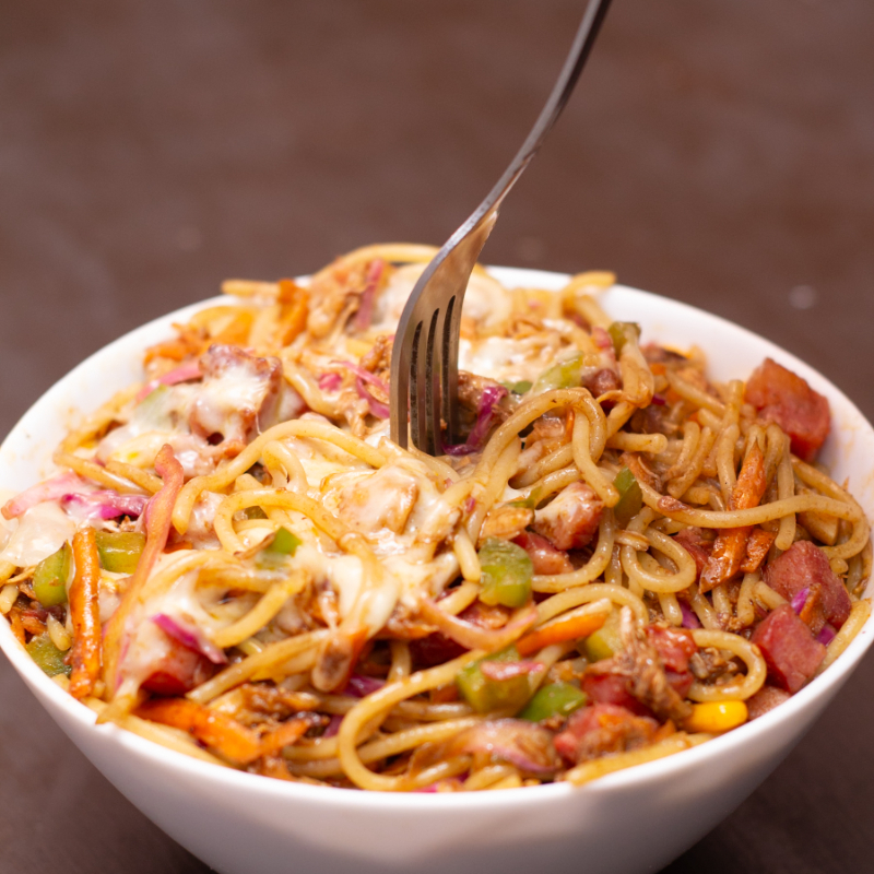 massa servida com repolho roxo, cenoura, pimentão, milho verde, bacon crocante, calabresa grelhada e frango desfiado. Um prato colorido, cheio de sabor e textura, perfeito para quem gosta de uma refeição completa.