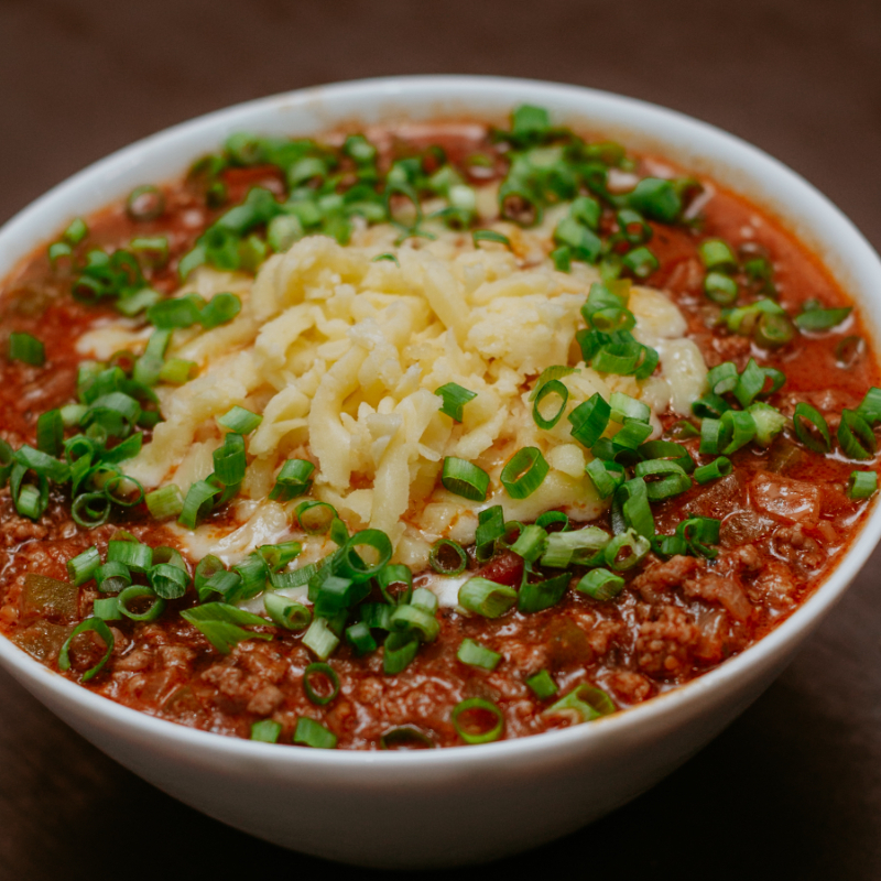 massa servida com molho bolonhesa, mussarela derretida e finalizada com folhas de cebolinha fresca. Um clássico saboroso e cheio de aroma.