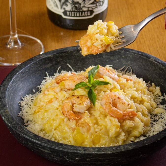 Um cremoso risoto de camarões com um toque de gengibre e manga.