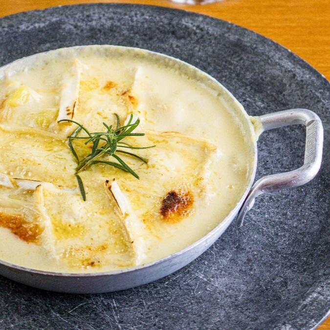 Gnocchi artesanal gratinado com fonduta de queijo com Brie assado.