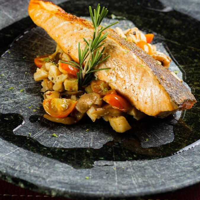 Filé de salmão grelhado acompanhado de palmito pupunha e cogumelos salteados.