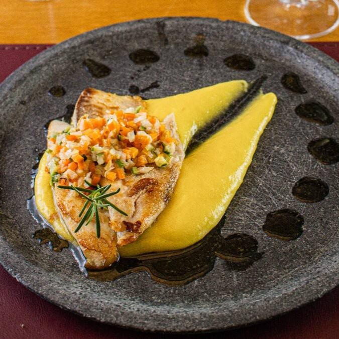 Peixe regional grelhado servido com purê de mandioquinha e vinagrete.