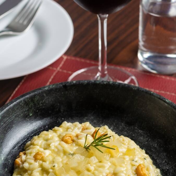 Um cremoso risoto de gorgonzola com pera em calda e nozes.
