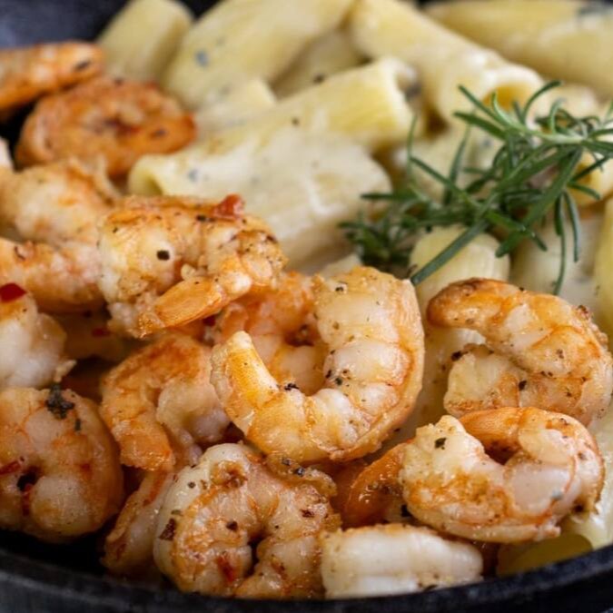 Macarrão Rigatoni servido com cremoso molho de gorgonzola e camarões salteados