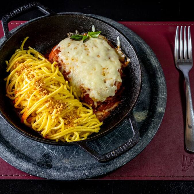 Filet Mignon empanado, coberto com molho pomodoro e queijo parmesão, acompanhado de spaghetti freco.