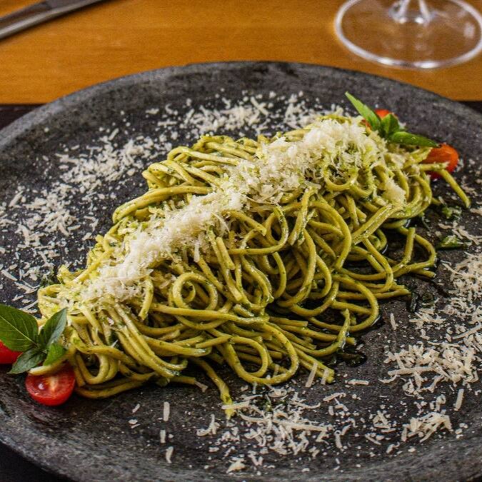 Nossa massa fresca artesanal com um delicioso molho pesto de manjericão.