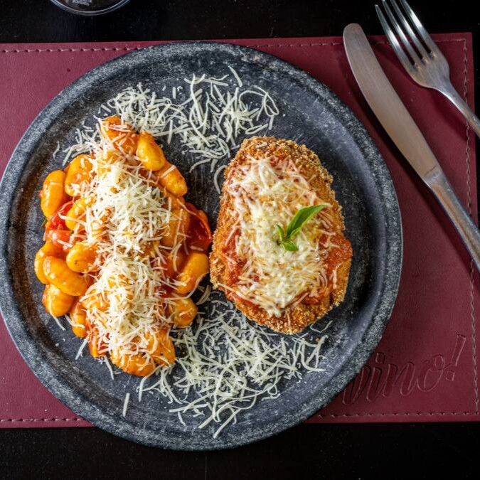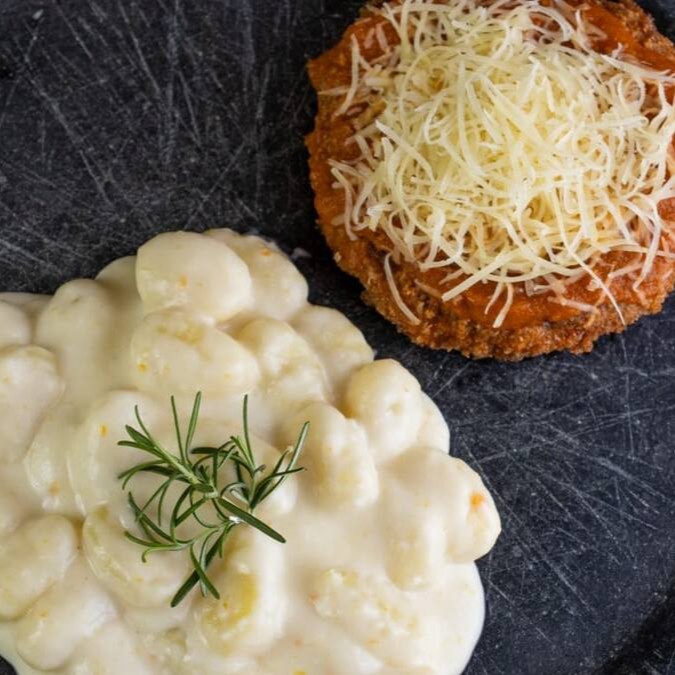 Gnocchi artesanal ao molho pomodoro com copalombo à milanesa.