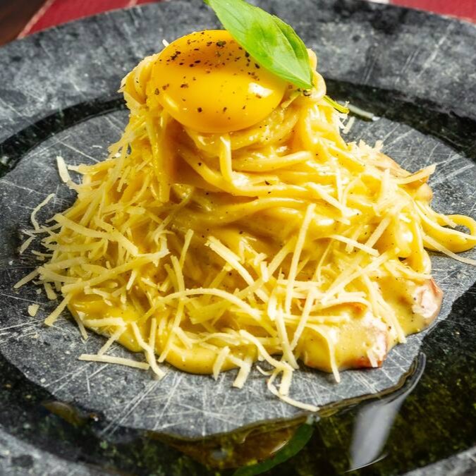 Massa fresca artesanal servida com um creme de parmesão emulsionado com gema caipira e bacon artesanal. Finalizado com gema mole por cima.