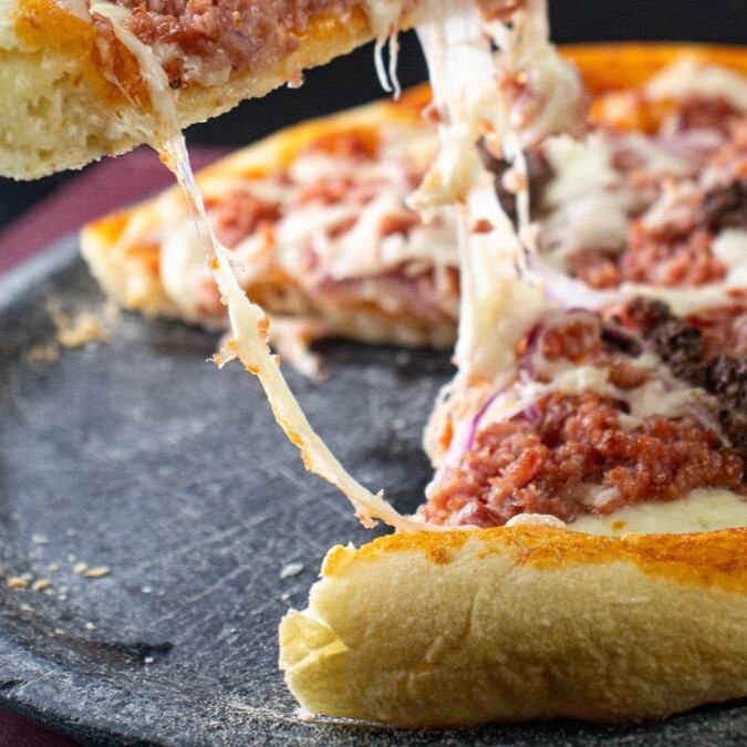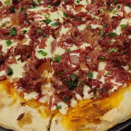 Massa de fermentação natural e lenta, passata italiana, carne seca, queijo meia cura e cebolinha verde.