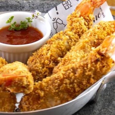 Camarões crocantes na farinha panko e fritos, servidos com marmelada de tomate picante.