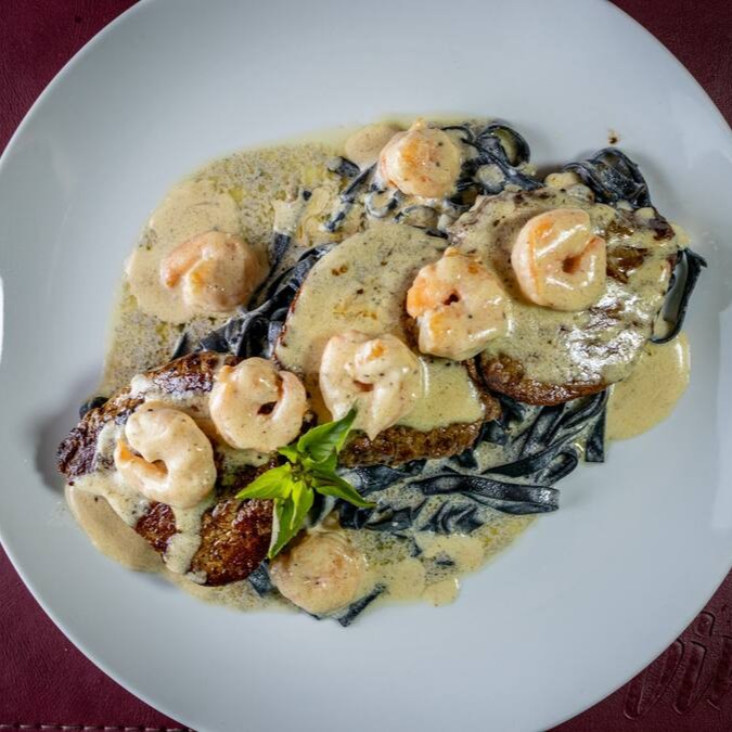 Mar e terra juntos, neste prato temos camarões e escalopes de migno, servidos com fetuccine negro e molho de champagne.