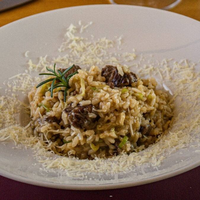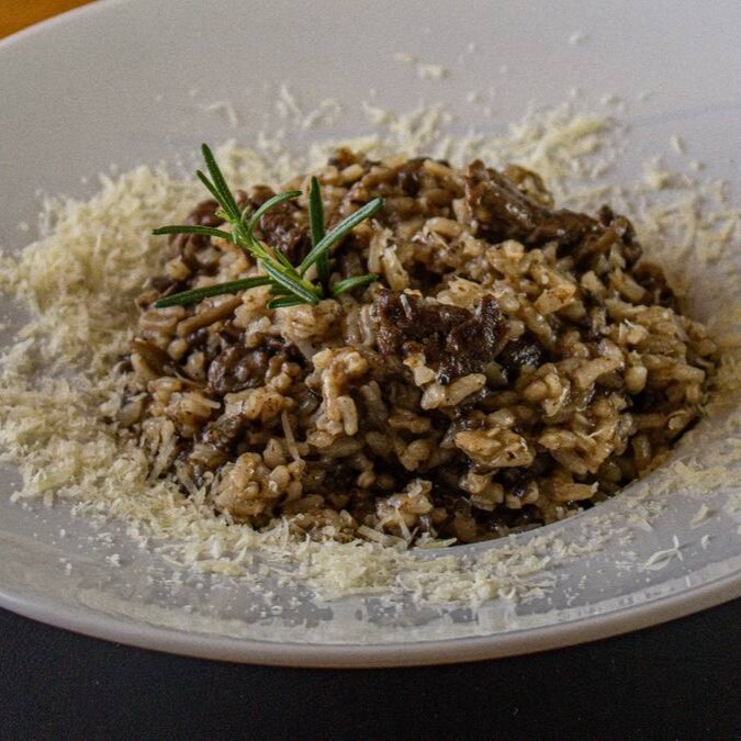 Um cremoso risoto de funghi secchi, mix de cogumelos frescos e lascas de filet mignon.