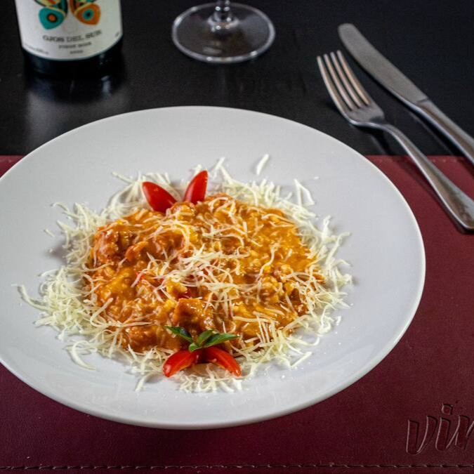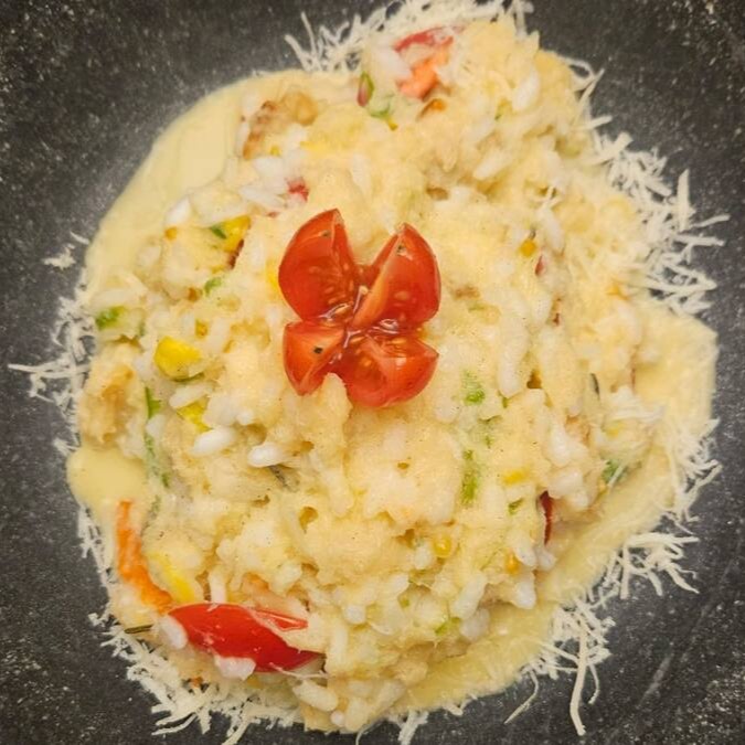 Delicioso e Cremoso risoto de linguiça artesanal com molho pomodoro e tomate cereja