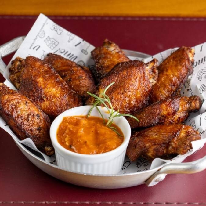 Asinha de frango fritas com lâminas de alho, acompanhados de um cremoso molho apimentado all'arrabiata.