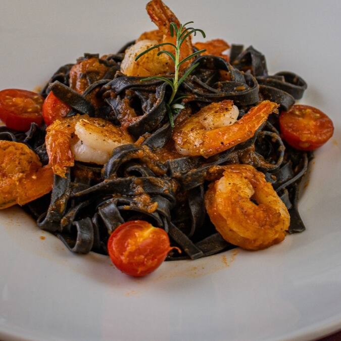 Massa negra artesanal feita com tinta de lula salteada com tomates e camarão, finalizado com azeite de ervas.