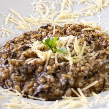 Um cremoso risoto de funghi secchi e mix de cogumelos frescos puxados na manteiga.
