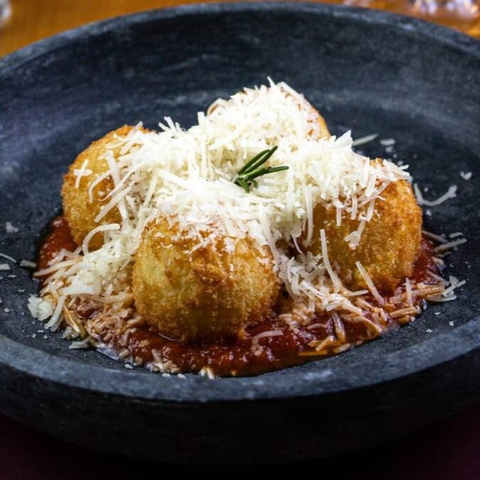 Delicioso bolinho de risoto com costela bovina, com queijo parmesão e açafrão servido com fonduta de formaggio.