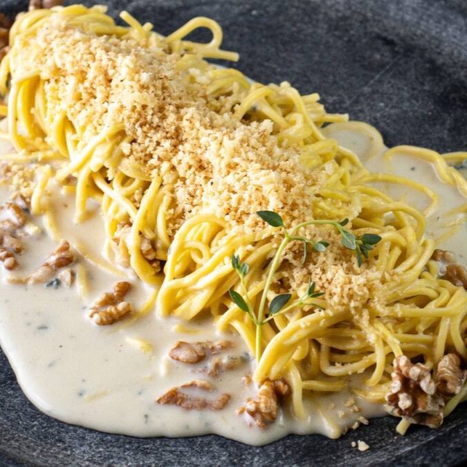 Massa fresca artesanal servida com um creme de queijo gorgonzola, nozes tostadas e farofinha de alho.