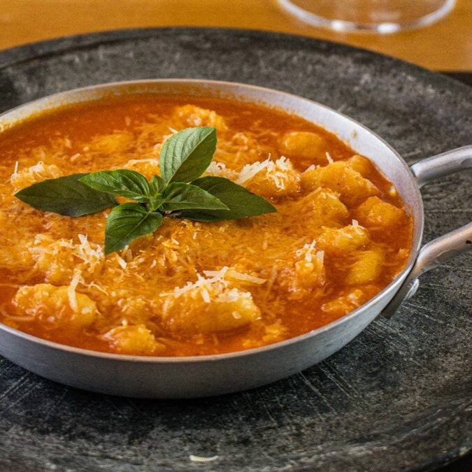 Gnocchi artesanal ao molho pomodoro e fonduta de formaggio.
