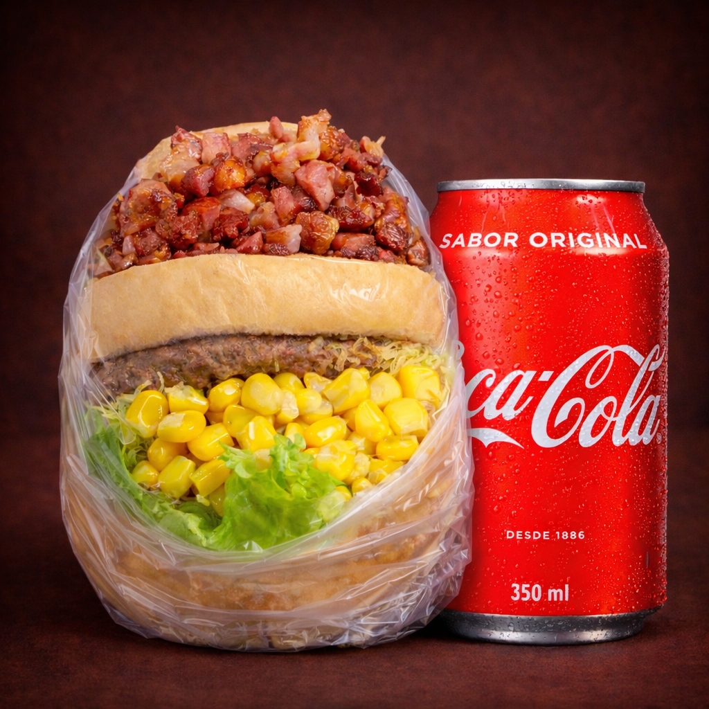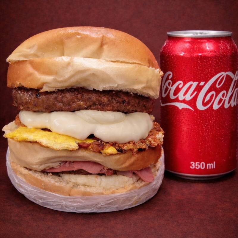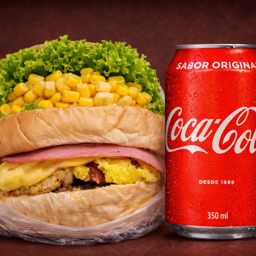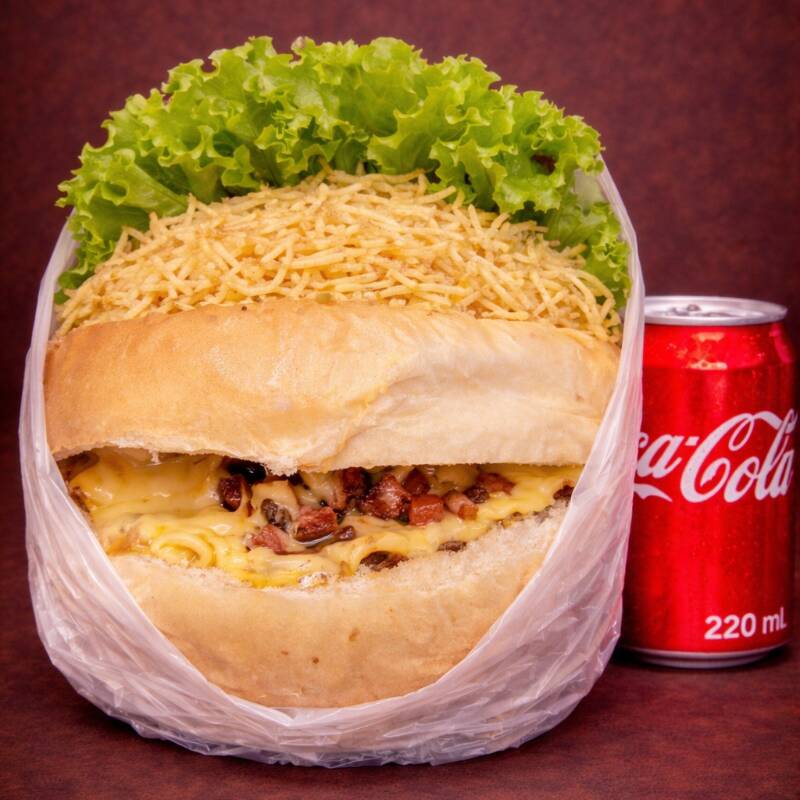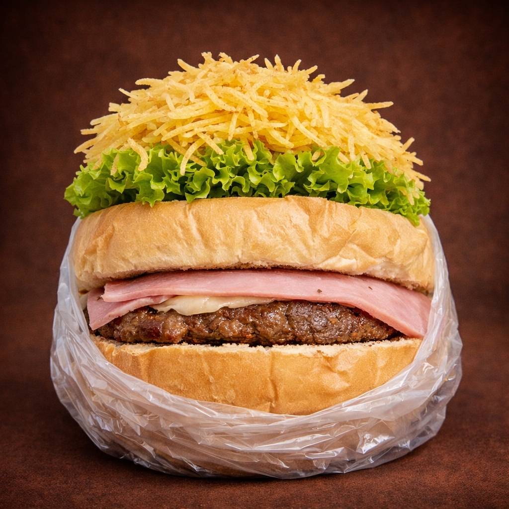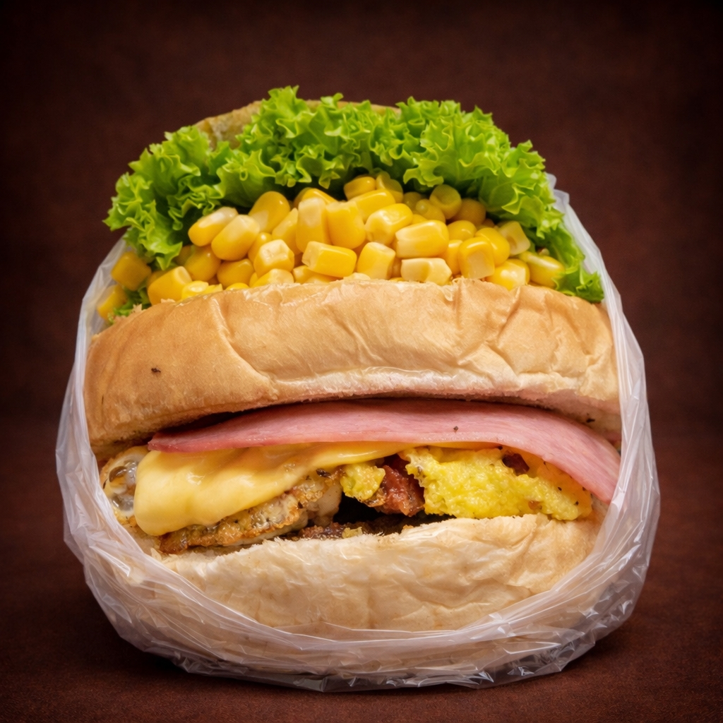 Pão, hambúrguer de boi, bacon, ovo, queijo, presunto, batata palha, milho, alface e molho especial