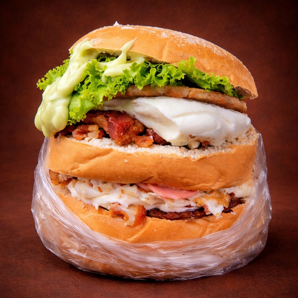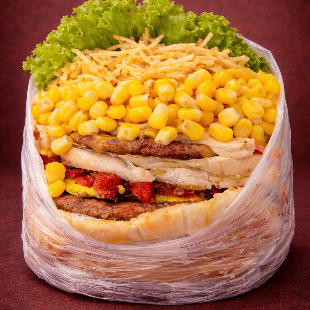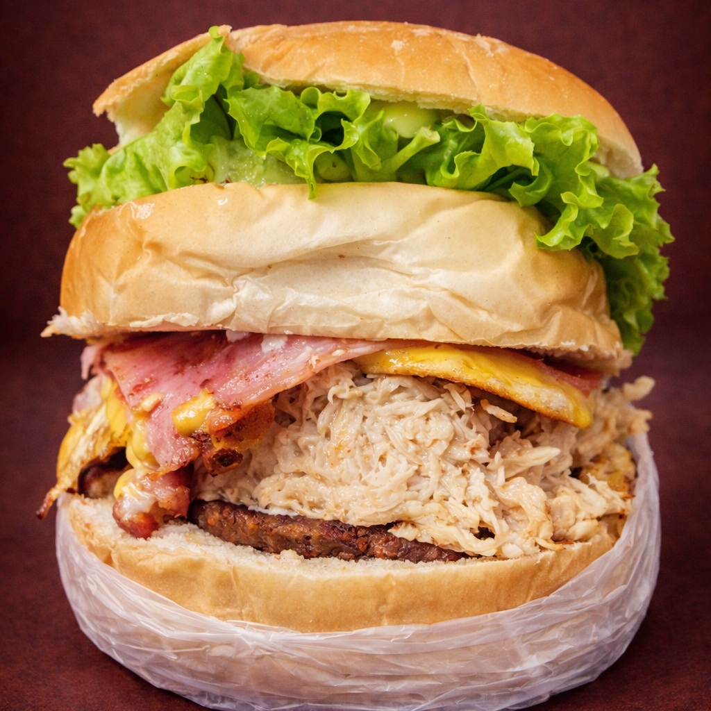 pão, hamburguer de boi, hamburguer de frango, ovo, bacon, catupiry, presunto, batata palha, milho, alface e molho especial