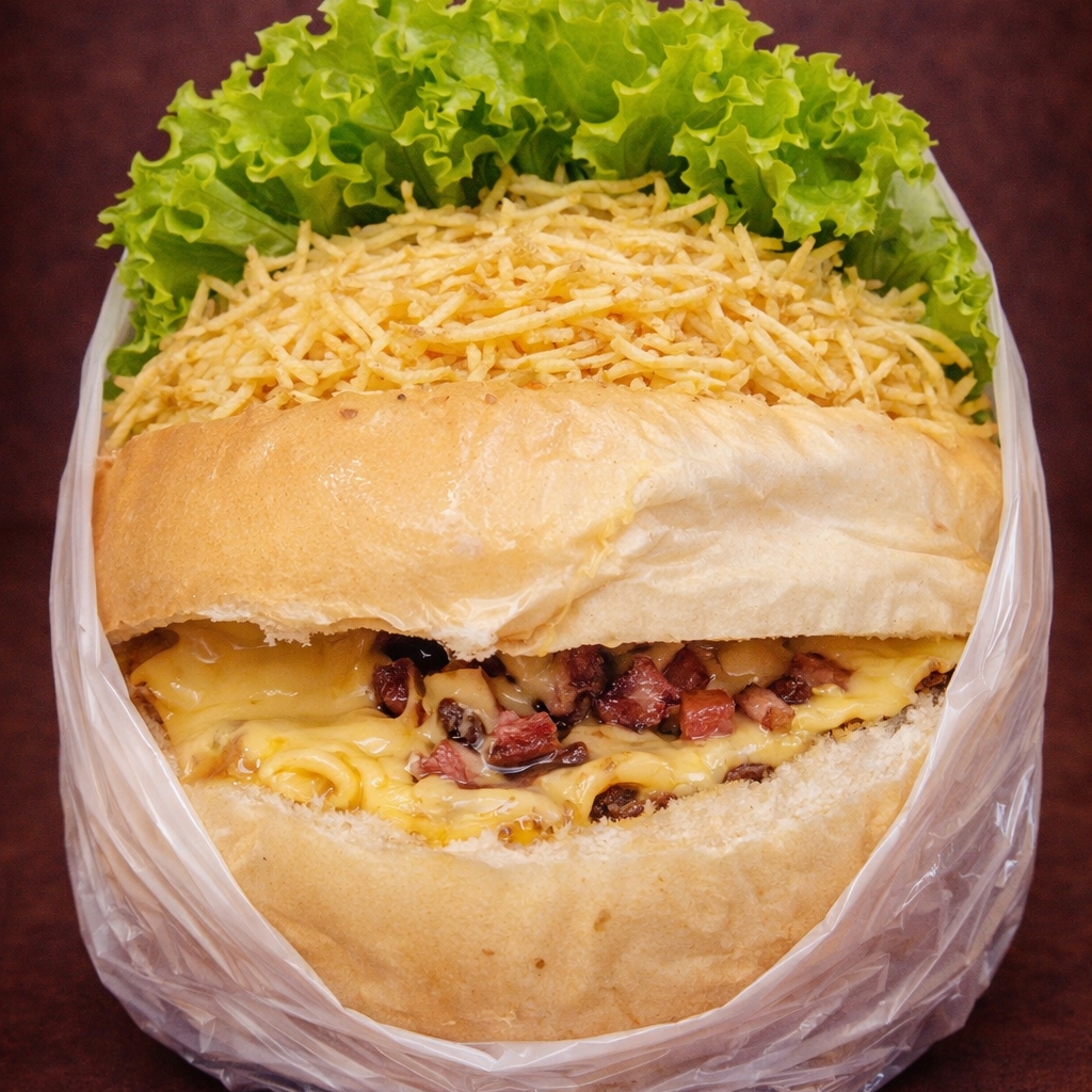 Pão, hambúrguer de boi, ovo, bacon, queijo prato derretido, batata palha, alface e molho especial