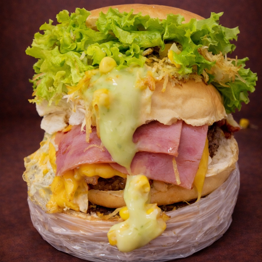 hamburguer de boi, ovo, bacon, queijo, presunto, batata palha, milho, alface e molho especial