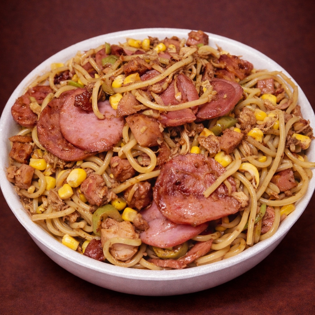 Macarrão, bacon, frango em cubo, calabresa, milho, azeitona,