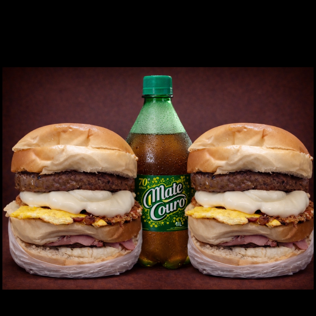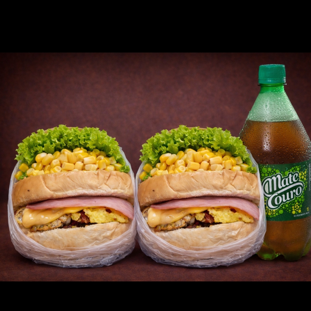 2 Hambúrguer de picanha 120g, catupiry, bacon, ovo, presunto, batata palha, milho, alface e molho